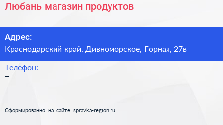 Любань, магазин продуктов по адресу Краснодарский край, Дивноморское, Горная, 27в в дальнейшем Организация, размещена в следующих категориях: