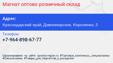 Магнат, оптово-розничный склад по адресу Краснодарский край, Дивноморское, Короленко, 3 в дальнейшем Организация, размещена в следующих категориях:
