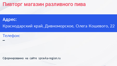 Пивторг, магазин разливного пива по адресу Краснодарский край, Дивноморское, Олега Кошевого, 22 в дальнейшем Организация, размещена в следующих категориях: