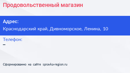 Продовольственный магазин по адресу Краснодарский край, Дивноморское, Ленина, 10 в дальнейшем Организация, размещена в следующих категориях: