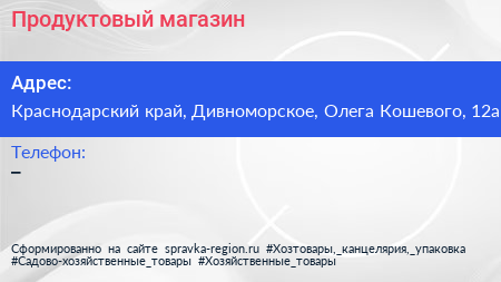 Продуктовый магазин по адресу Краснодарский край, Дивноморское, Олега Кошевого, 12а в дальнейшем Организация, размещена в следующих категориях: