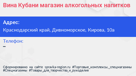 Вина Кубани, магазин алкогольных напитков по адресу Краснодарский край, Дивноморское, Кирова, 10а в дальнейшем Организация, размещена в следующих категориях: