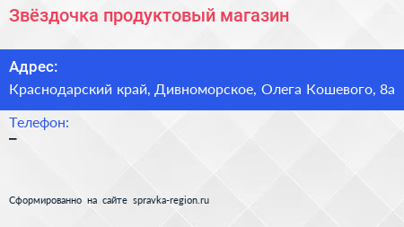 Звёздочка, продуктовый магазин по адресу Краснодарский край, Дивноморское, Олега Кошевого, 8а в дальнейшем Организация, размещена в следующих категориях: