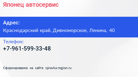 Японец, автосервис по адресу Краснодарский край, Дивноморское, Ленина, 40 в дальнейшем Организация, размещена в следующих категориях: