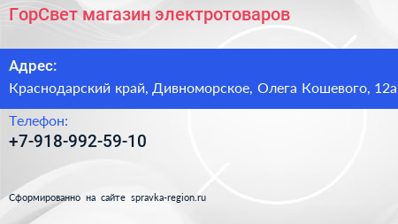 ГорСвет, магазин электротоваров по адресу Краснодарский край, Дивноморское, Олега Кошевого, 12а в дальнейшем Организация, размещена в следующих категориях: