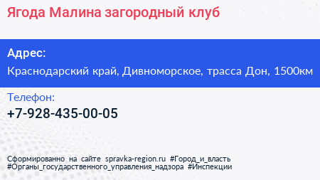 Ягода Малина, загородный клуб по адресу Краснодарский край, Дивноморское, трасса Дон, 1500км в дальнейшем Организация, размещена в следующих категориях: