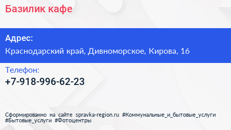 Базилик, кафе по адресу Краснодарский край, Дивноморское, Кирова, 16 в дальнейшем Организация, размещена в следующих категориях:
