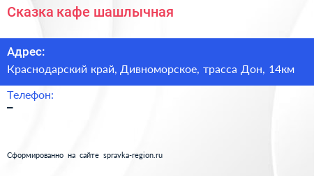Cказка, кафе-шашлычная по адресу Краснодарский край, Дивноморское, трасса Дон, 14км в дальнейшем Организация, размещена в следующих категориях: