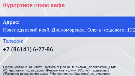 Курортное плюс, кафе по адресу Краснодарский край, Дивноморское, Олега Кошевого, 10Б в дальнейшем Организация, размещена в следующих категориях: