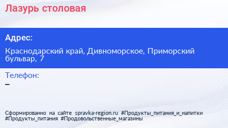 Лазурь, столовая по адресу Краснодарский край, Дивноморское, Приморский бульвар, 7 в дальнейшем Организация, размещена в следующих категориях:
