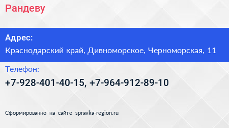 Рандеву по адресу Краснодарский край, Дивноморское, Черноморская, 11 в дальнейшем Организация, размещена в следующих категориях: