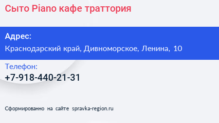 Сыто Piano, кафе-траттория по адресу Краснодарский край, Дивноморское, Ленина, 10 в дальнейшем Организация, размещена в следующих категориях: