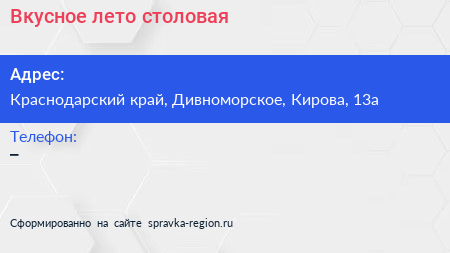 Вкусное лето, столовая по адресу Краснодарский край, Дивноморское, Кирова, 13а в дальнейшем Организация, размещена в следующих категориях: