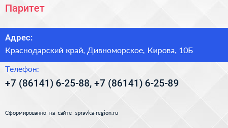 Паритет по адресу Краснодарский край, Дивноморское, Кирова, 10Б в дальнейшем Организация, размещена в следующих категориях: