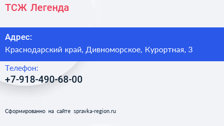 ТСЖ Легенда по адресу Краснодарский край, Дивноморское, Курортная, 3 в дальнейшем Организация, размещена в следующих категориях: