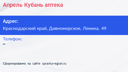 Апрель Кубань, аптека по адресу Краснодарский край, Дивноморское, Ленина, 49 в дальнейшем Организация, размещена в следующих категориях: