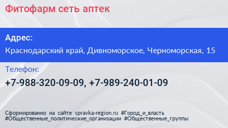 Фитофарм, сеть аптек по адресу Краснодарский край, Дивноморское, Черноморская, 15 в дальнейшем Организация, размещена в следующих категориях: