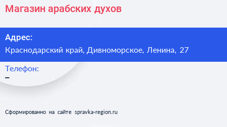 Магазин арабских духов по адресу Краснодарский край, Дивноморское, Ленина, 27 в дальнейшем Организация, размещена в следующих категориях: