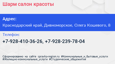 Шарм, салон красоты по адресу Краснодарский край, Дивноморское, Олега Кошевого, 8 в дальнейшем Организация, размещена в следующих категориях: