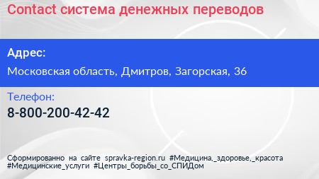 Contact, система денежных переводов по адресу Московская область, Дмитров, Загорская, 36 в дальнейшем Организация, размещена в следующих категориях: