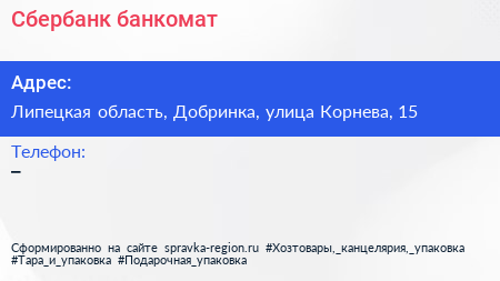 Сбербанк, банкомат по адресу Липецкая область, Добринка, улица Корнева, 15 в дальнейшем Организация, размещена в следующих категориях: