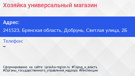 Хозяйка, универсальный магазин по адресу 241523, Брянская область, Добрунь, Светлая улица, 2Б в дальнейшем Организация, размещена в следующих категориях: