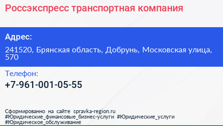 Россэкспресс, транспортная компания по адресу 241520, Брянская область, Добрунь, Московская улица, 570 в дальнейшем Организация, размещена в следующих категориях: