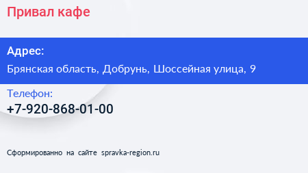 Привал, кафе по адресу Брянская область, Добрунь, Шоссейная улица, 9 в дальнейшем Организация, размещена в следующих категориях: