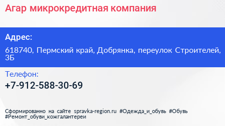 Агар, микрокредитная компания по адресу 618740, Пермский край, Добрянка, переулок Строителей, 3Б в дальнейшем Организация, размещена в следующих категориях: