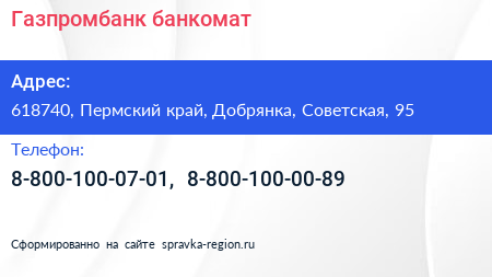 Газпромбанк, банкомат по адресу 618740, Пермский край, Добрянка, Советская, 95 в дальнейшем Организация, размещена в следующих категориях: