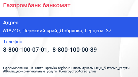 Газпромбанк, банкомат по адресу 618740, Пермский край, Добрянка, Герцена, 37 в дальнейшем Организация, размещена в следующих категориях: