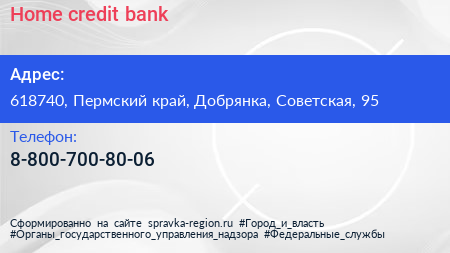 Home credit bank по адресу 618740, Пермский край, Добрянка, Советская, 95 в дальнейшем Организация, размещена в следующих категориях: