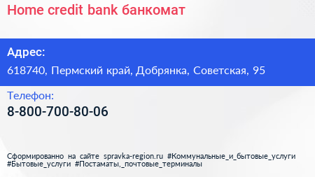 Home credit bank, банкомат по адресу 618740, Пермский край, Добрянка, Советская, 95 в дальнейшем Организация, размещена в следующих категориях: