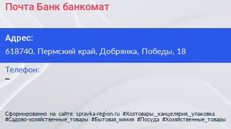 Почта Банк, банкомат по адресу 618740, Пермский край, Добрянка, Победы, 18 в дальнейшем Организация, размещена в следующих категориях: