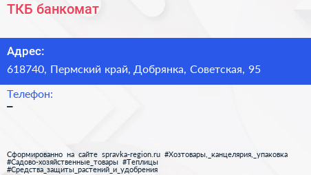 ТКБ, банкомат по адресу 618740, Пермский край, Добрянка, Советская, 95 в дальнейшем Организация, размещена в следующих категориях: