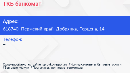 ТКБ, банкомат по адресу 618740, Пермский край, Добрянка, Герцена, 14 в дальнейшем Организация, размещена в следующих категориях: