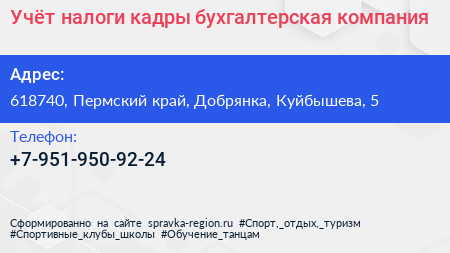 Учёт, налоги, кадры, бухгалтерская компания по адресу 618740, Пермский край, Добрянка, Куйбышева, 5 в дальнейшем Организация, размещена в следующих категориях: