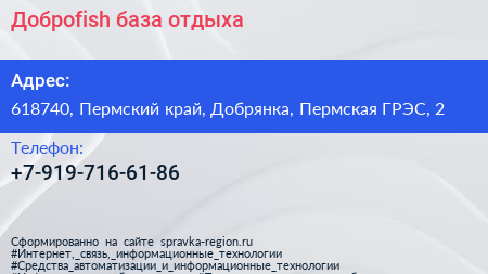 Доброfish, база отдыха по адресу 618740, Пермский край, Добрянка, Пермская ГРЭС, 2 в дальнейшем Организация, размещена в следующих категориях: