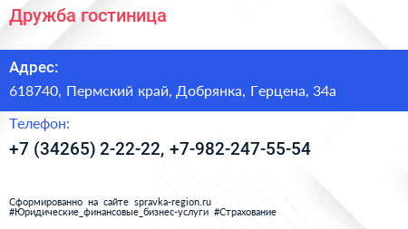 Дружба, гостиница по адресу 618740, Пермский край, Добрянка, Герцена, 34а в дальнейшем Организация, размещена в следующих категориях: