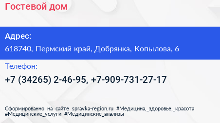 Гостевой дом по адресу 618740, Пермский край, Добрянка, Копылова, 6 в дальнейшем Организация, размещена в следующих категориях: