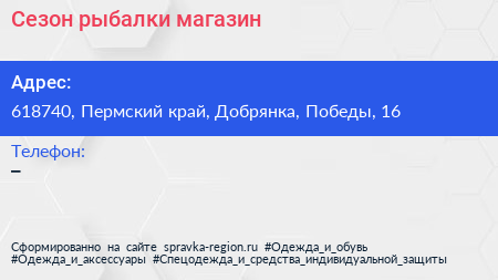 Сезон рыбалки, магазин по адресу 618740, Пермский край, Добрянка, Победы, 16 в дальнейшем Организация, размещена в следующих категориях: