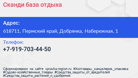 Сканди, база отдыха по адресу 618711, Пермский край, Добрянка, Набережная, 1 в дальнейшем Организация, размещена в следующих категориях: