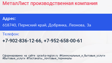 МеталЛист, производственная компания по адресу 618740, Пермский край, Добрянка, Леонова, 3а в дальнейшем Организация, размещена в следующих категориях: