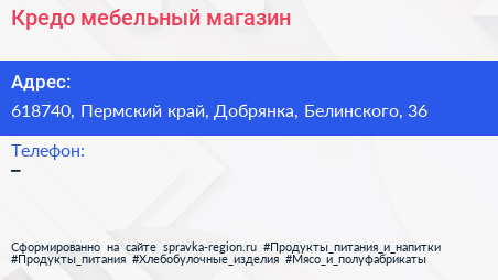 Кредо, мебельный магазин по адресу 618740, Пермский край, Добрянка, Белинского, 36 в дальнейшем Организация, размещена в следующих категориях: