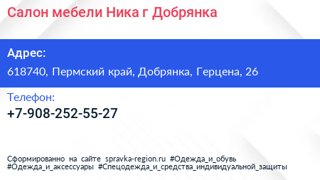 Салон мебели Ника, г. Добрянка по адресу 618740, Пермский край, Добрянка, Герцена, 26 в дальнейшем Организация, размещена в следующих категориях: