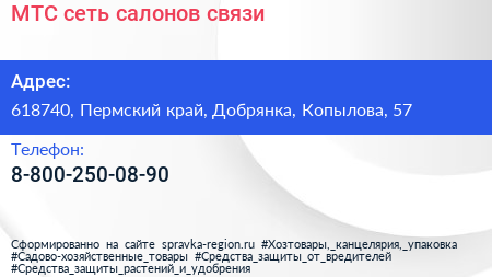 МТС, сеть салонов связи по адресу 618740, Пермский край, Добрянка, Копылова, 57 в дальнейшем Организация, размещена в следующих категориях: