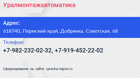Уралмонтажавтоматика по адресу 618740, Пермский край, Добрянка, Советская, 68 в дальнейшем Организация, размещена в следующих категориях: