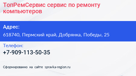 ТопРемСервис, сервис по ремонту компьютеров по адресу 618740, Пермский край, Добрянка, Победы, 25 в дальнейшем Организация, размещена в следующих категориях: