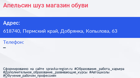 Апельсин-шуз, магазин обуви по адресу 618740, Пермский край, Добрянка, Копылова, 63 в дальнейшем Организация, размещена в следующих категориях: