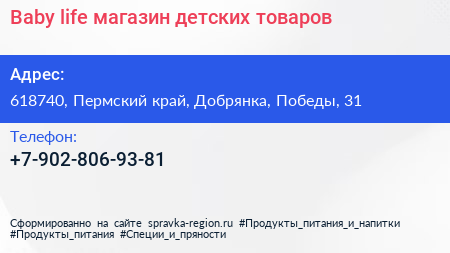 Baby life, магазин детских товаров по адресу 618740, Пермский край, Добрянка, Победы, 31 в дальнейшем Организация, размещена в следующих категориях: